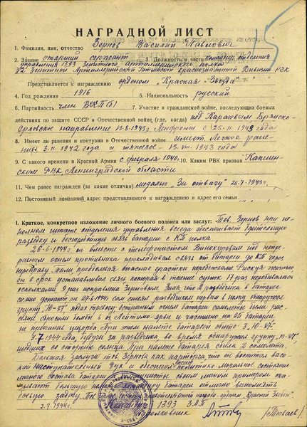 Справка: воин «Зернов Василий Павлович 1916 (1915» ст. сержант, ком. отд. управления, награждён ОРДЕНОМ КРАСНОЙ ЗВЕЗДЫ