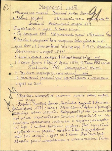Справка: воин «Быстров Антон Михайлович 1909» красноармеец вет. службы, санитар армейского ветеринарного лазарета № 671, награждён МЕДАЛЬЮ «ЗА БОЕВЫЕ ЗАСЛУГИ»