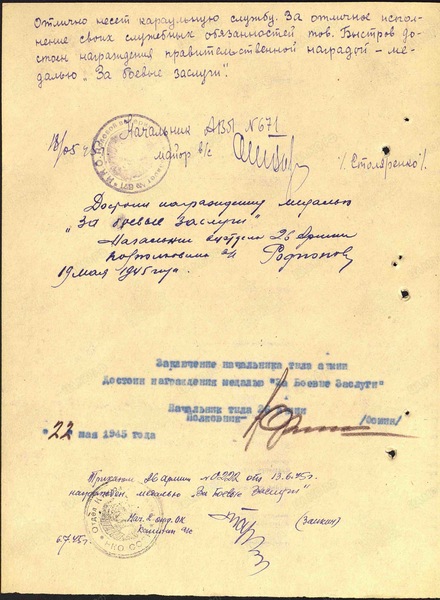 За отличное исполнение своих служебных обязанностей тов. Быстров достоин награждения — МЕДАЛЬЮ «ЗА БОЕВЫЕ ЗАСЛУГИ