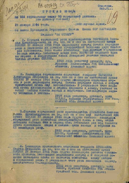 Справка: воин «Ермолаев Сергей Петрович» сержант, 166 сп 98 сд, награждён Медалью «За Оборону Ленинграда»