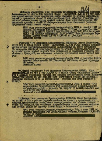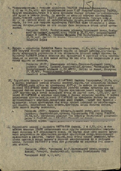 «Шофера 1-го дивизиона, красноармейца Рыбакова Ивана Федоровича за то, что в бою в районе Скурц-Волленталь на глазах у противника под сильным артминометным огнем завез непосредственно на огневые позиции более 700 снарядов, чем обеспечил подразделениям полка успешное выполнение боевой задачи по прорыву полосы Скурц-Волленталь противника»