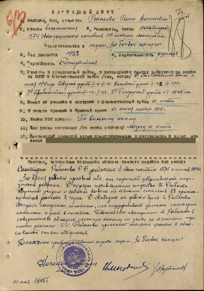 Справка: воин «Рыбакова Раиса Васильевна 1922 (Никитина» санитарка, вольнонаемная, награждена МЕДАЛЬЮ «ЗА БОЕВЫЕ ЗАСЛУГИ»