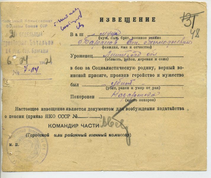 Извещение о гибели воина = похоронка