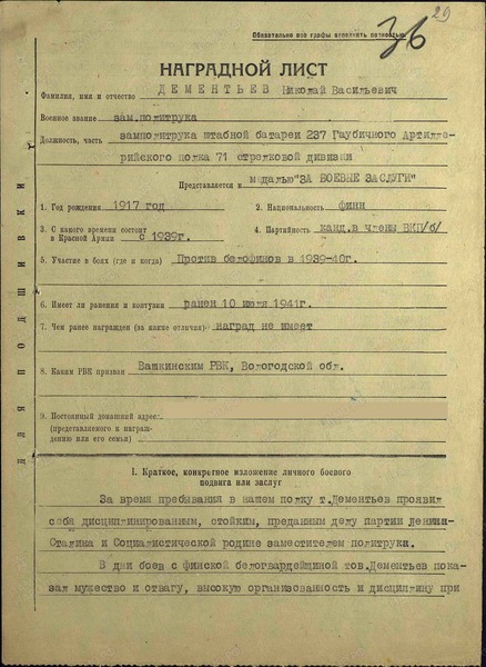 Справка: воин «Дементьев Николай Васильевич 1917» зам. политрука штабной батареи, награждён МЕДАЛЬЮ «ЗА БОЕВЫЕ ЗАСЛУГИ»