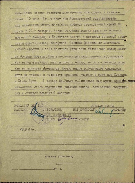 10 июля 1941 г. в боях под Корписелькой тов. Дементьев под минометным огнем белофиннов добился установления связи КП полка с ОП 9 батареи.