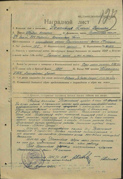10.04.1945 г. тов. Дементьев, будучи легко ранен, остался на поле боя, продолжает выполнять свою работу.