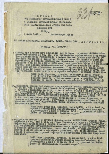 «Командира пулеметного отделения 4-й батареи, сержанта Добромыслова Якова Семеновича за то, что при уничтожении прорвавшейся окруженной Ясско-Кишиневской группировки в районе Онешти, своим пулеметным отделением уничтожил 3 пулеметных точки и более 15 солдат и офицеров противника.