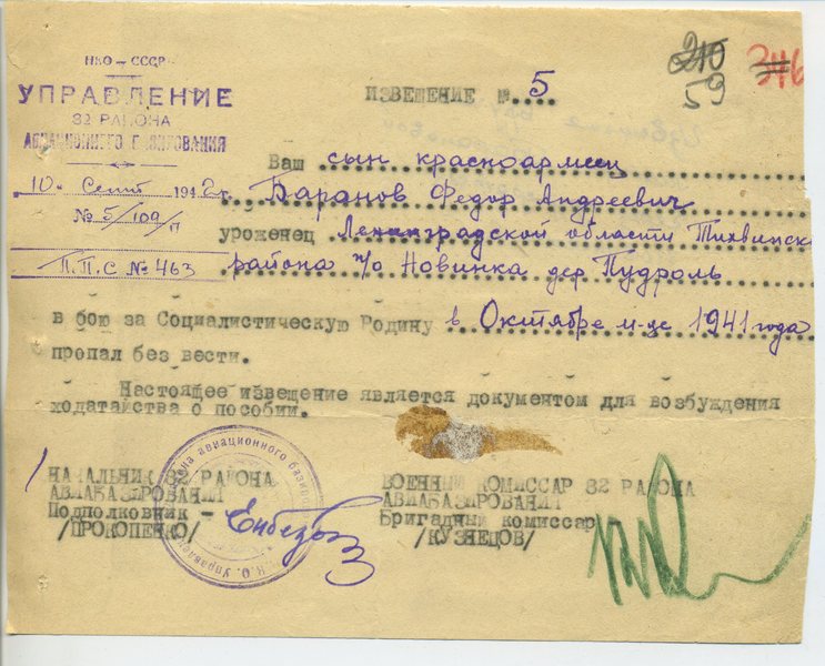 Баранов Федор Андреевич (пост 61 хар 1918 хар 2017_1 под Тих рядовой похоронка РВК призыв РВК Пудроль пр.б/в 26.10.1941-06.11.1941 82 РАБ, 57 БАО 50722120 408763461 ВПП нет подвиг нет