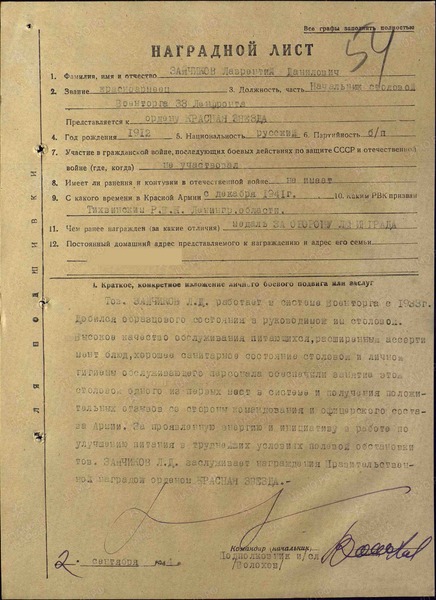 За проявленную энергию и инициативу в работе по улучшению питания в труднейших условиях полевой обстановки тов. Зайчиков Л.Д. заслуживает награждения правительственной наградой - ОРДЕНОМ КРАСНОЙ ЗВЕЗДЫ