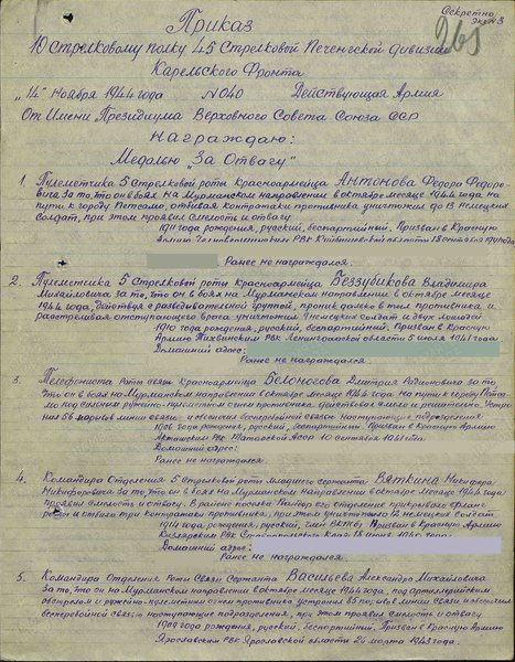 «Пулеметчика 5 стрелковой роты, красноармейца Беззубикова Владимира Михайловича за то, что он в боях на Мурманском направлении в октябре месяце 1944 года, действуя с разведывательной группой, проник далеко в тыл противника и расстреливая отступающего врага, уничтожил 4 немецких солдат и двух лошадей»