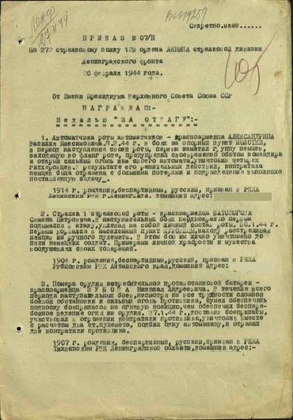 Справка: воин «Зубов Николай Андреевич» красноармеец, номер орудия, 272 сп 123 сд, награждён Медалью «За Оборону Ленинграда»