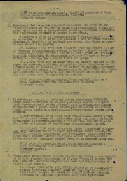 Тов. Моисеев, презирая опасность для жизни, под арт. обстрелом устранил 9 порывов линии связи, тем самым способствовал своевременному открытию нашего огня по вражеским батареям