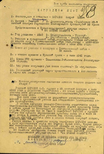 «Рядовой Баранов А.И. служит в 25 штабной батарее с июня 1943 года в должности телефониста.