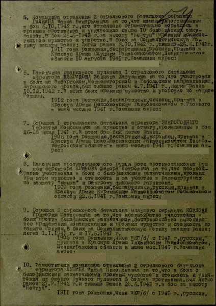 В боях за социалистической Родину дважды ранен: 01.01.1943 г. и 17.06.1943 г.