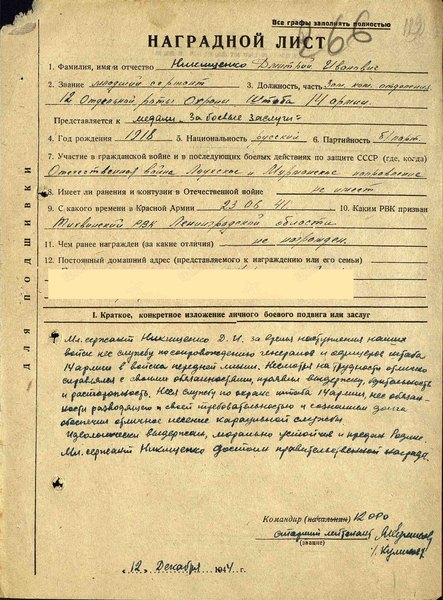 «Мл. сержант Никищенко Д.И. за время наступления наших войск нес службу по сопровождению генералов и офицеров штаба 14 Армии в войска передней линии.