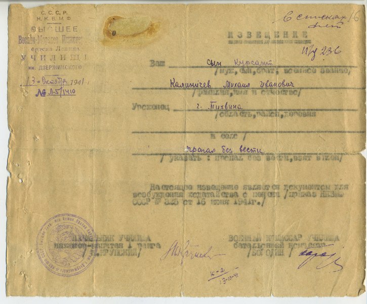 Файл: «Тихвин_Архив_РВК_Похоронки_Калиничев.М.И_01»