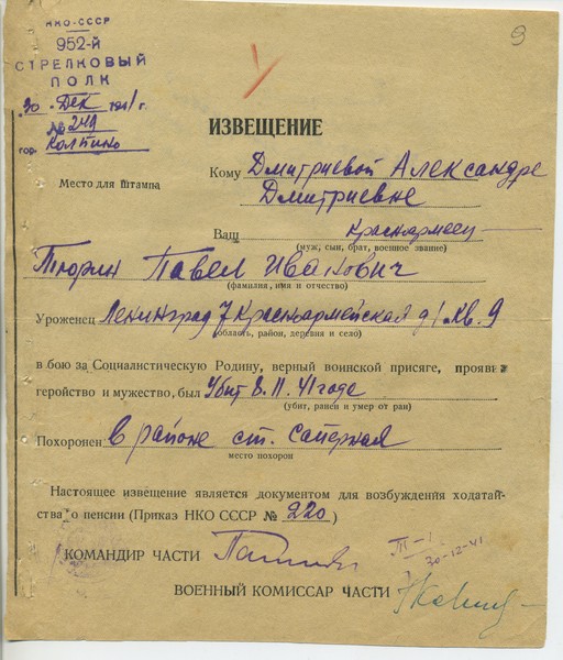 Извещение о гибели воина = похоронка