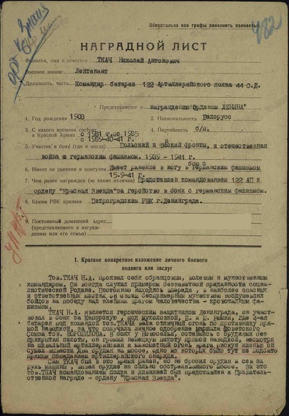 Ткач Н.А. является героическим защитником Ленинграда, он участвовал в боях за Капорскую, под Мухоловкой, Б и М. Рюмки, где 4-ая батарея, под командованием тов. Ткача вела отличный огонь по противнику прямой наводкой, за что получила личное одобрение маршала Советского Союза тов. Ворошилова.