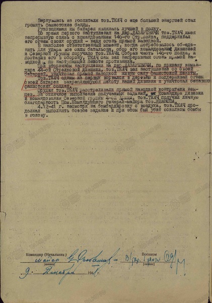 «Тов. Ткач Н.А. проявил себя образцовым, волевым и мужественным командиром.