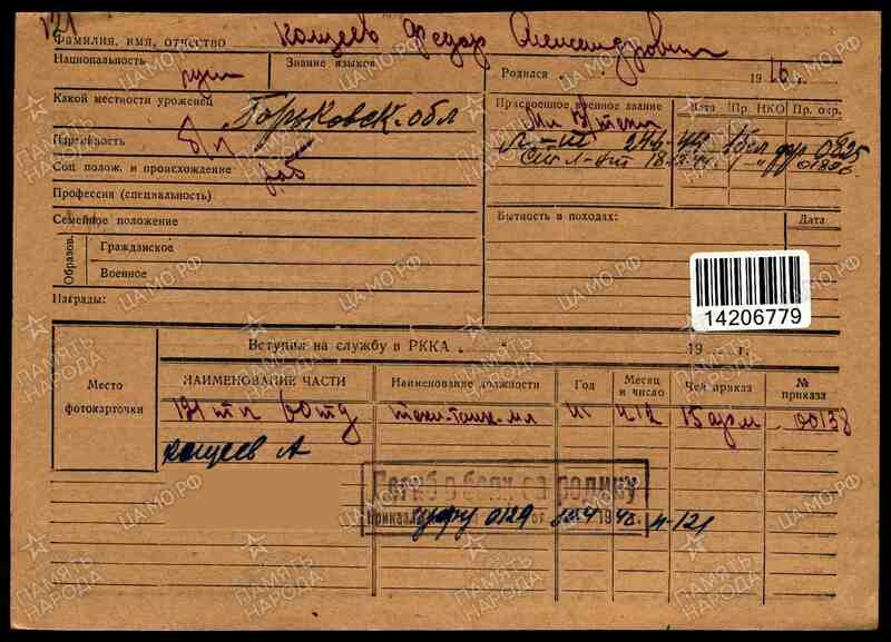 Личные данные: Челябинская область Уйский район село Соколовка (станица Соколовская), проживавший перед призывом в Красную Армию в Свердловской области городе Свердловск-12 (ныне - Екатеринбург) Проспект Сталина (ныне - Орджоникидзе) дом 12 квартира 3, русский, урожденный Верхнеуральского отдела Оренбургского казачьего войска, беспартийный, закончил техникум, рабочий, до призыва в армию работал токарем-расточником на заводе "Уралмаш"