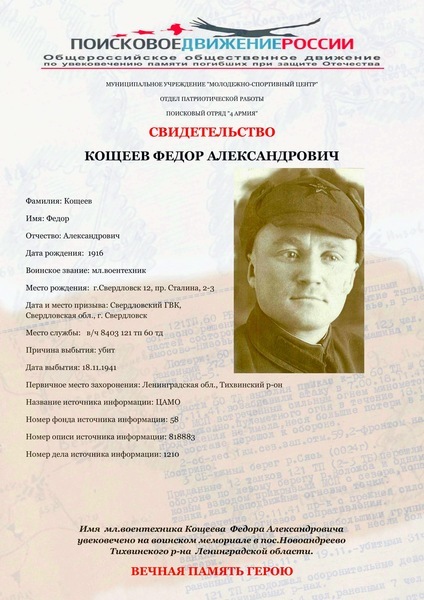 Справка: по воину «Кощеев Федор Александрович 1916 (Кащеев» строка в эксель-базе безвозвратных потерь по Тихвину и Тихвинскому р-ну выглядит так:
