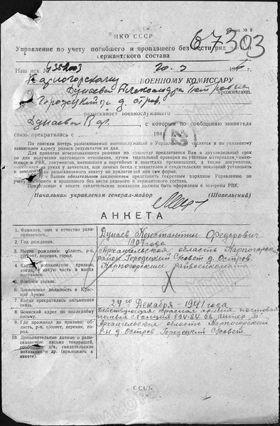 Из военкомата пришло письмо, чтобы увековечить на братском кладбище Дунаева Константина Федоровича, 1907 года рождения, пропавшего без вести в декабре 1941 года. Есть ли у вас какие-нибудь документы или данные по данному бойцу…»