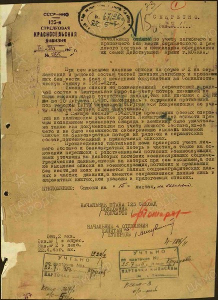 «При сем высылаю именные списки по форме Nº 2 на сержантский и рядовой состав частей дивизии, погибших и пропавших без вести в боях с немецкими оккупантами за Социалистическую Родину в 1941-42 годах.
