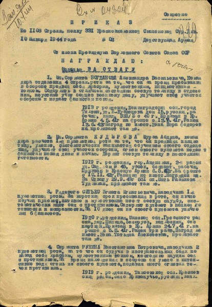 Справка: воин «Богданов Александр Васильевич (Владимирович 1913» мл. сержант, ком. стр. отделения, награждён МЕДАЛЬЮ «ЗА ОТВАГУ»