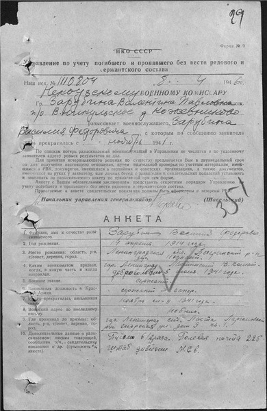 «… Всё началось с фотографии, которая долгое время стояла в буфете на даче. На ней трое братьев (кроме моего отца, почему-то). Самый старший - Иван - 1911 г.р., Василий - 1914, и Виктор - 1920. Все, по документам, и даже мой отец, ушли в РККА раньше начала войны. Наверное, чувствовалось, что уже скоро… Василий к этому времени был женат на Валентине (это она его разыскивала в 1948-49 годах). Все остальные сведения я нашла у Вас. Ничего в семье не сохранилось. (Да и не очень-то пытались, наверное… Валентина вышла замуж ещё раз и не часто с нами общалась). Наверное, могу добавить только место рождения и родителей Василия, и то с не точными датами рождений и смерти. Отец братьев, мой дед - Зарубин Фёдор Антонович - погиб в лагерях в 1938 … на волне доносов или зависти к работящей и материально крепкой семье, «добрые» люди накапали на деда... С помощью ссылки на сайте «Бессмертный полк» я нашла документ о втором дяде, пропавшем без вести осенью 41-го. Теперь собираюсь к юбилею Победы про всех сделать записи на том сайте и пойти с фотографиями на демонстрацию. Хочу добраться до могилы Василия … С уважением - Надежда…»