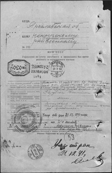 «1. сержант Зарубин Василий Федорович 1914, умер от ран 21.12.1941
