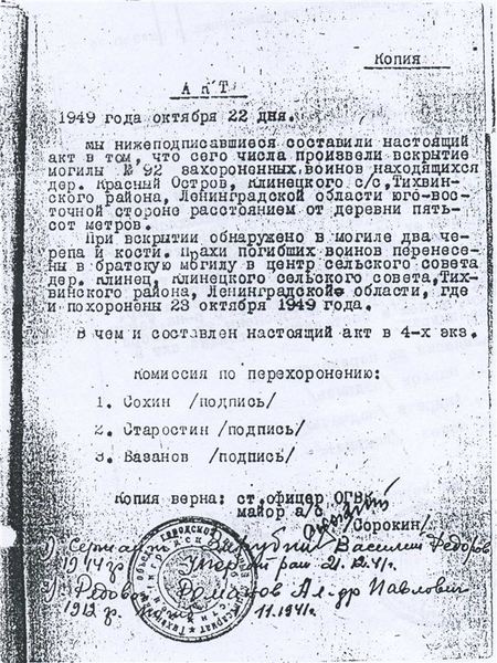 Мы, нижеподписавшиеся, составили настоящий АКТ в том, что сего числа произвели вскрытие могилы № 92 захороненных воинов, находящихся в дер. Красный Остров, Клинецкого с/с, Тихвинского района, Ленинградской области юго-восточной стороне, расстоянием от деревни пятьсот метров.