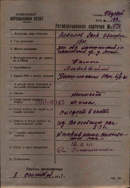 После дополнительных разговоров с сыном воина «Веселов Егор Иванович 1901» (ему щас 90 лет) выяснилось (а по подворовому обходу это 03.1942) крайняя весточка (письмецо размером с открытку не сохранилось), мол, едем под Москву…