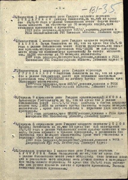«Минометчика 1 минометной роты, гвардии ефрейтора Грузинского Капитона Ивановича за то, что во время боя в районе Синявинских высот, при отражении контратаки противника тов. Грузинский из личного оружия уничтожил трех фашистских захватчиков»