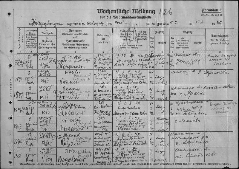 Умерших в лазарете лагеря № 100 в Порхове с 09.02.1942 по 15.02.1942