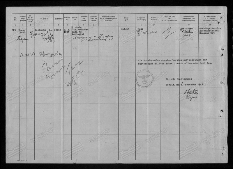 Справка: поскольку, сведения о воине «Чурин Борис Николаевич (Чурис, 1894 27.04.1893» фигурируют в немецких архивах ( http://www.dokst.ru ), то там могут быть «живые» документы, а не только идентификационные ссылки