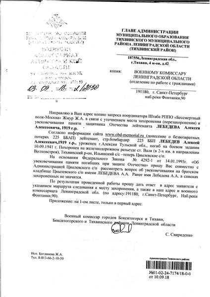 Лебедев Алексей Алексеевич (1914 1919 сви 2017_1 Свирь раз. Валя, Кировская ж/д, 2 км от ст. в направлении Волховстроя личка адм лейтенант сбили свои истребители 10.09.1941 225 СБАП, 3 РАГ 9308584 9557013 9557413 9556944 ВПП нет подвиг нет