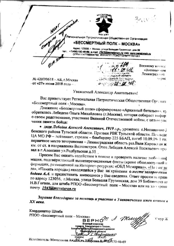 13.09.2018 в личку пришёл ветвистый запрос по военной судьбе «Лебедев Алексей Алексеевич (1914 1919»: