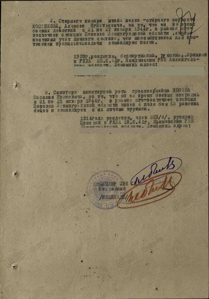 Подвиг ID: 20029488; Медаль «За Боевые Заслуги» от 29.01.1944; источник: 296 сп 13 сд ЛенФ
