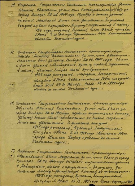 «Стрелка 1 стрелкового батальона, красноармейца Ионова Василия Ивановича за то, что в наступательном бою за город Выборг 20.06.1944 года храбро и стойко дрался против лахтарей, лично сам уничтожил 3-х финских солдат, первым с призывом «За Родину» поднимался в атаку»