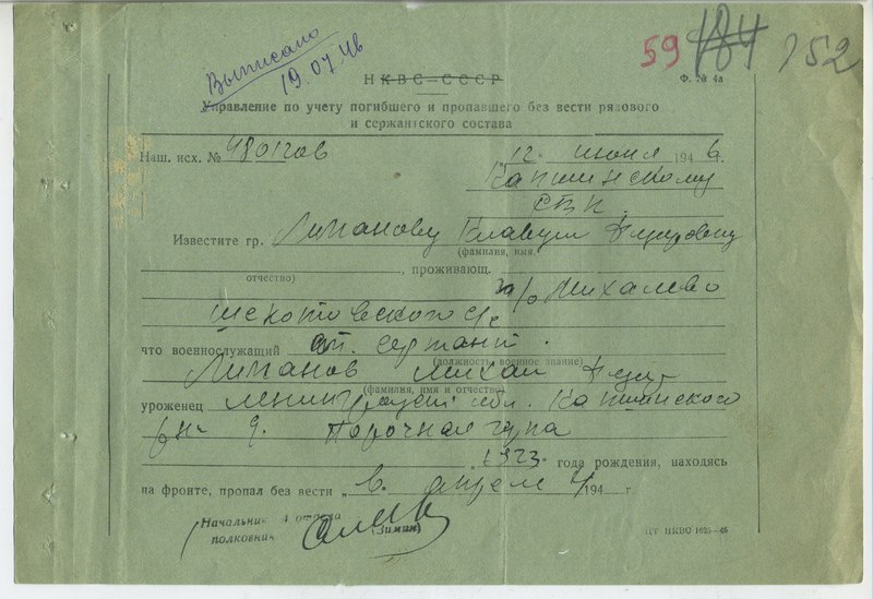 Файл: «Тихвин_Архив_РВК_Похоронки_Липанов.М.Ф_Наградной»