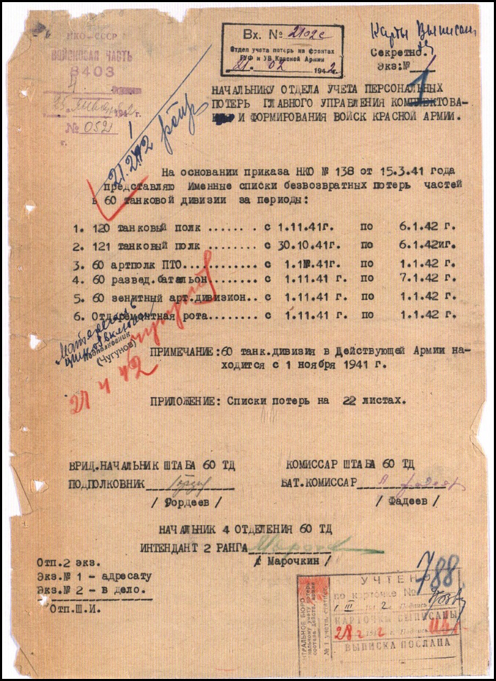 Как видно из приведенного выше текста, именной список безвозвратных потерь личного состава 60 танковой дивизии составлен 25 января 1942 года. А в Отделе учета персональных потерь на фронтах ГУФ и УВ (Главного управления формирования и укомплектования войск) Красной Армии он зарегистрирован за Nº 2102с и того позже - 21 февраля 1942 года.