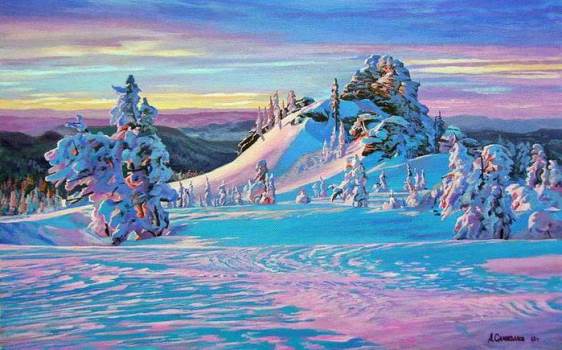 Пурпурный рассвет - это относительно редкое оптическое явление, которое наблюдается зимой в "чистой" атмосфере. Явление хорошо изучено специалистами и широко распространенно в природе (Ну, недаром же оно столь любимо фотографами и художниками!). Возникает в морозную погоду. Земля покрыта чистым белым снегом. Воздух достаточно влажен, насыщен мельчайшими, почти невидимыми, ледяными частичками. Солнце находится еще за горизонтом ниже 4 градусов. И вот на рассвете при этих природных условиях наблюдается пурпурное сияние снегов. Продолжительность явления составляет не более 20-30 минут. Интенсивность пурпурного сияния увеличивается с повышением прозрачности воздуха и возрастанием высоты места наблюдения. Если на рассвете отмечается высокая облачность, то эффект усиливается за счет многократного отражения света от поверхности облаков и снежного белого покрова.
