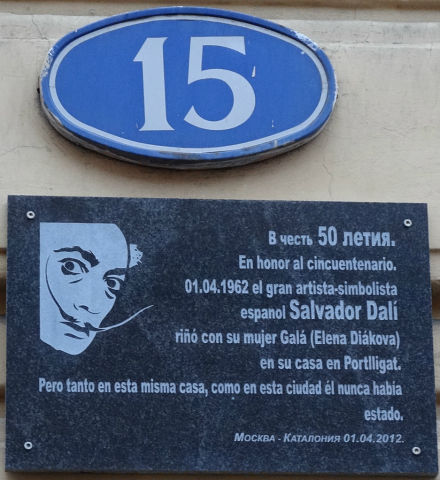 Итак, номер дома виден, а вот улица - неизвестна. Да и что, интересно, там написано? Кроме этого уже понятного "В честь 50-летия" и "Москва - Каталония, 01.04.2012"?