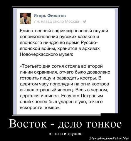 А творцам кинематографии мировой и развлекательной, например, дарю бесплатно очень перспективную идею. Начинайте снимать серию фильмов о ниндзя и казаках! Тут все монахи Шаолиня вместе с Брюсами Ли с Джеки Чанами просто отдыхать будут!