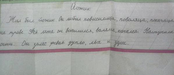 Жил бил йожик. Он любил повисилица, поваляца, покачаца на траве. Фсе лета он висилился, валялся, качался. Наступила осень. Он залес фсвае дупло, лех и здох.